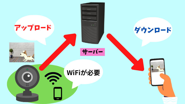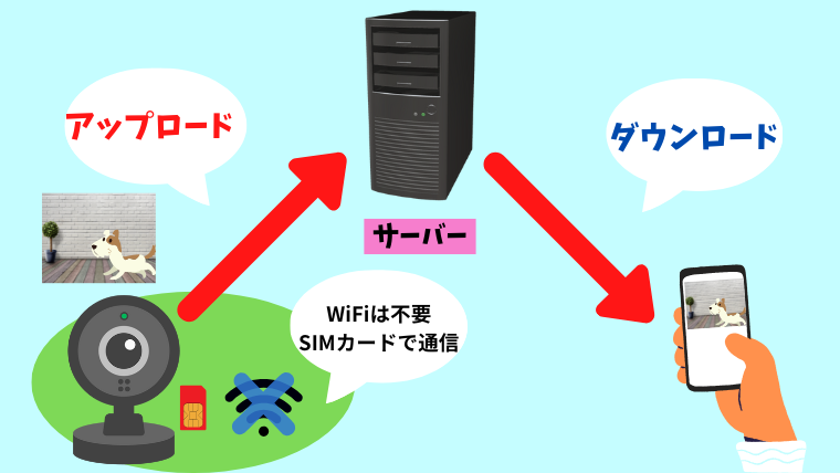 通常のペットカメラはこのようにWifiが必要。wifiが必要ないカメラの仕組みとしては、wifiの電波を使わずにカメラ自体がスマホのように通信して映像を送信しています。